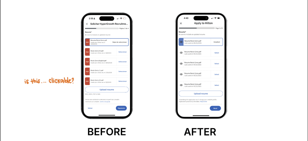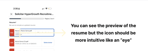 Replaced the PDF icon with an intuitive eye icon to clearly communicate the preview functionality. Users now immediately understand they can view their resume before selecting it, without needing to memorize that the PDF icon served this purpose.