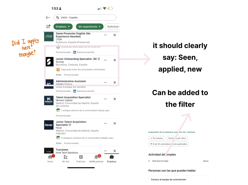 Users can't easily track the status of their job applications. LinkedIn doesn't clearly communicate where each application stands in the process, forcing users to remember which jobs they've viewed, applied to, or received responses from.
